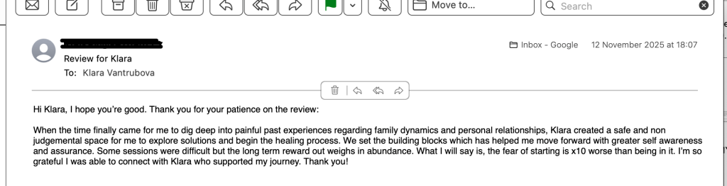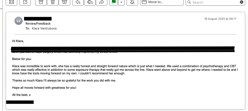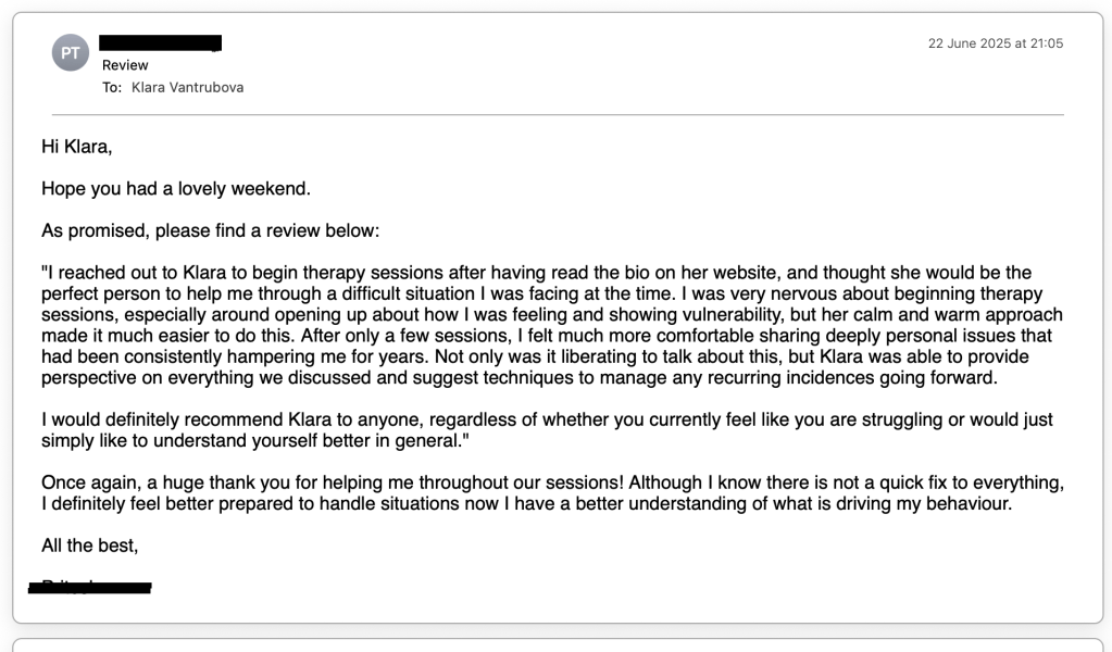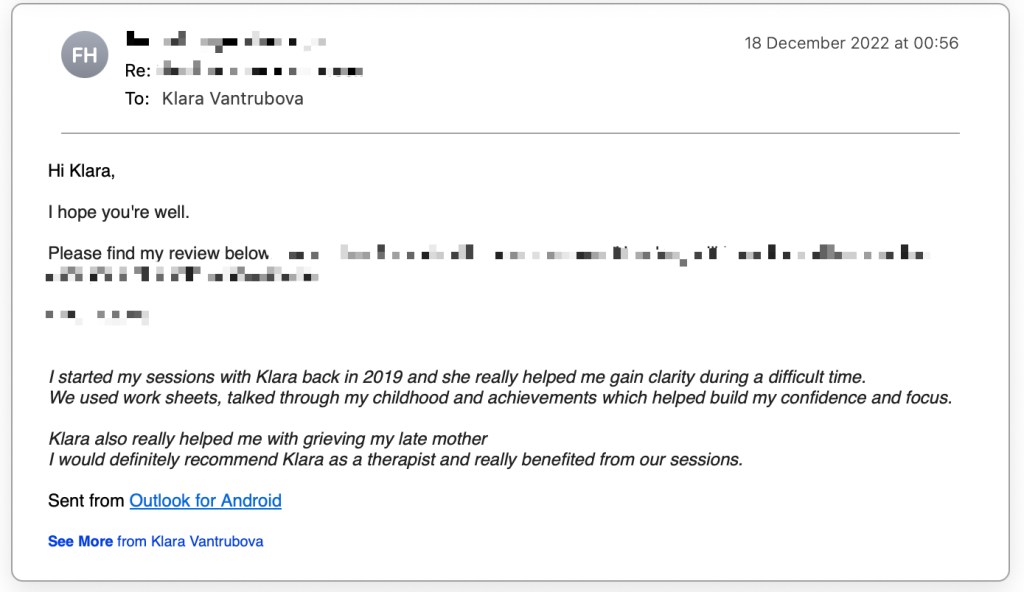 “I started my sessions with Klara back in 2019 and she really helped me gain clarity during a difficult time. We used work sheets, talked through my childhood and achievements which helped build my confidence and focus.Klara also really helped me with grieving my late mother I would definitely recommend Klara as a therapist and really benefited from our sessions.”