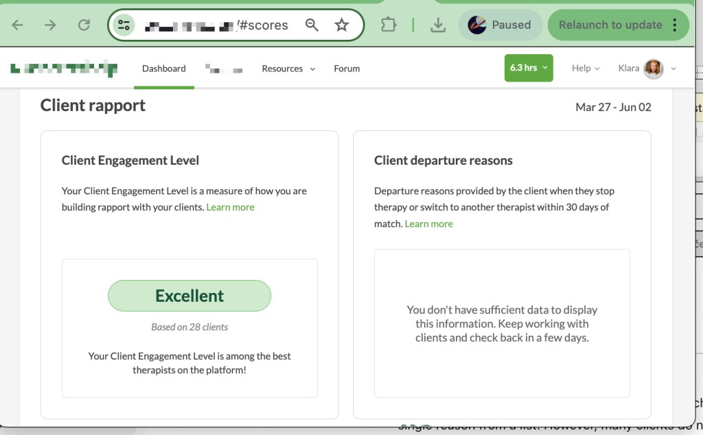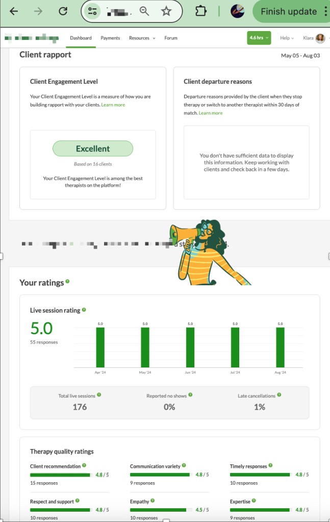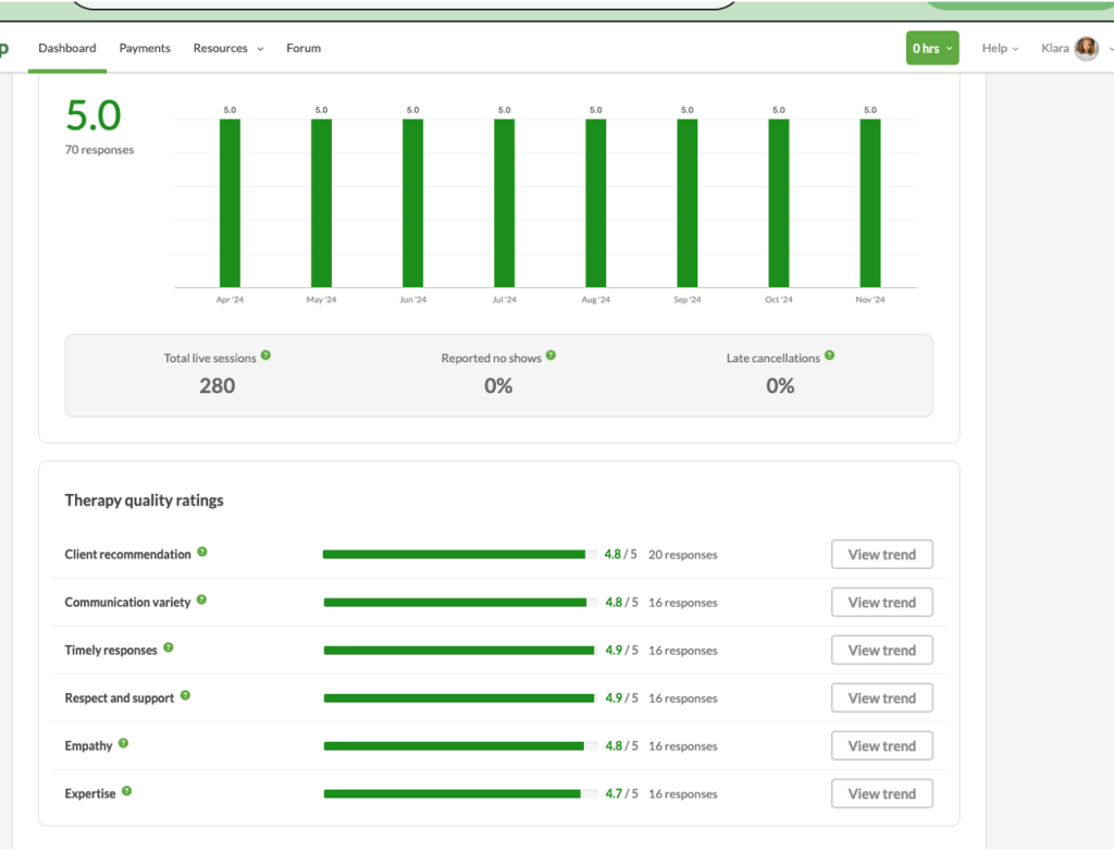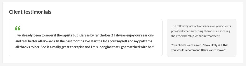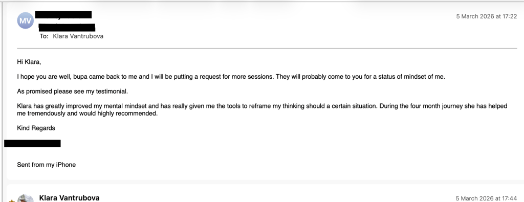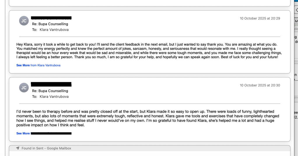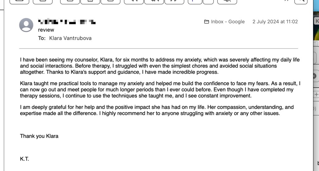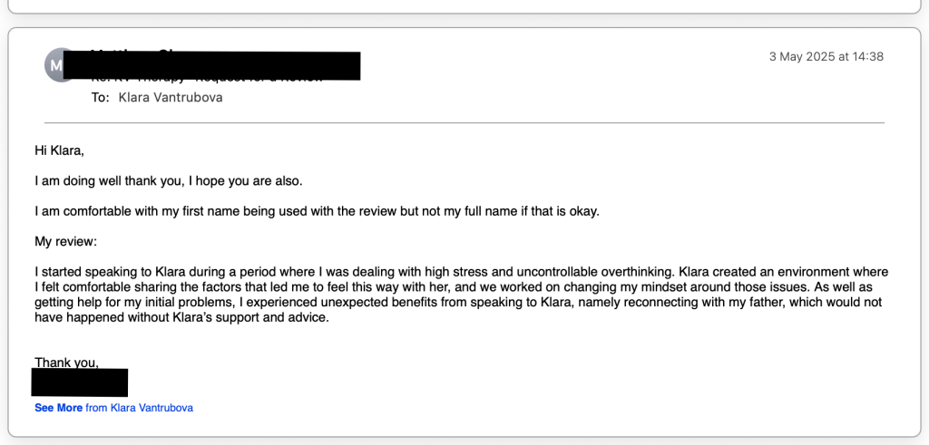“I’ve been feeling really good about the sessions with Klára. Sometimes I stress myself out a bit, thinking I need to have something to talk about, but I’ve realized it’s OK if I don’t always have a big thing to say. It doesn’t mean everything’s perfect, and that’s been really helpful to understand. Looking back on the last 10 sessions, I can see that things have either got better or at least haven’t gotten worse, and that feels like progress. It’s just nice to have that space to talk and figure stuff out. I’m glad I started, and it’s good to know I can book sessions even when I just feel like I need to check in or feel OK.” M. December 2024