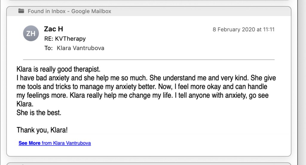 “Klara was recommended from my friend in a moment when I didn’t know anymore what to do with my strong anxiety attacks. After a few sessions she helped me to see the concrete problems. We are still working on them together but I feel much better. I am always looking forward to having our session.” Vanda