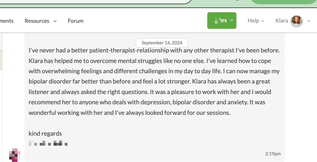 “Klara really helped me to see different perspectives of my life and we work towards my life goal. Satisfactory service. Thank you Klara” – Anonym May 2021